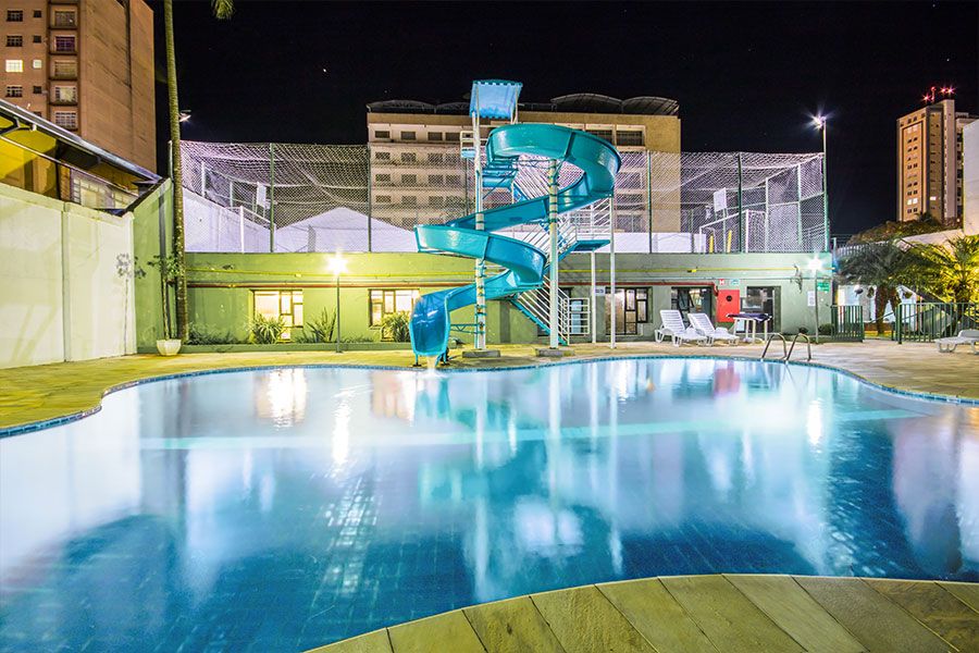 Piscina com tobangan, e piscina aquecida; Academia, Área kids.
